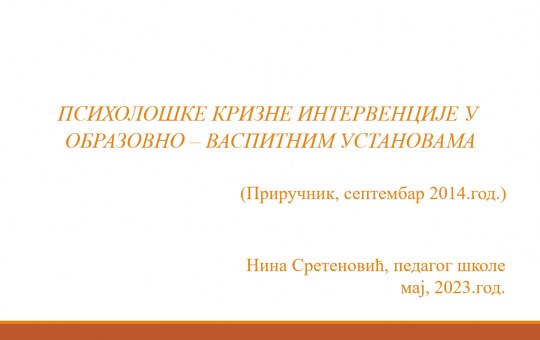 На седници Наставничког већа, одржаној 17.05.23.године, Нина Сретеновић педагог школе реализовала је презентацију на тему: „ Психолошке кризне интервенције у...